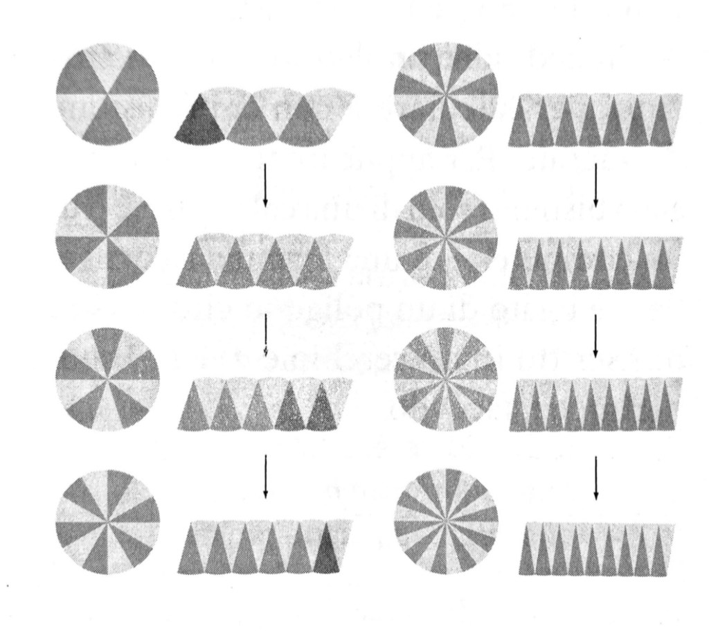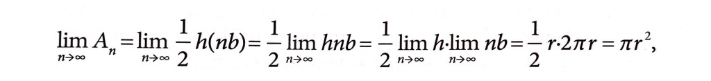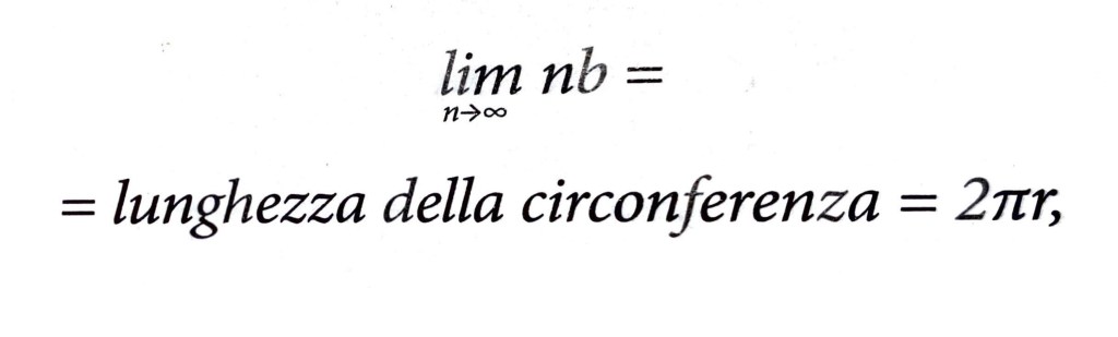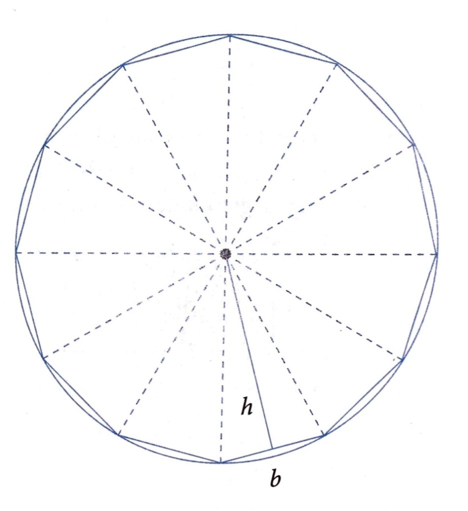 Infatti, e di questo possiamo avere una conferma visiva, l’altezza del triangolo (h) si avvicina molto a quella del raggio della circonferenza, come la somma di tutte le basi (b) si avvicina molto al perimetro della circonferenza; quanti più triangoli si hanno (aumenta n), tanto più quest’impressione si acuisce. A maggior ragione se n tende ad infinito.