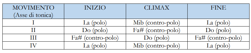 In effetti, in questo caso la simmetria è visibile nella forma stessa del movimento, definita da alcuni “struttura ad arco”, in quanto composta di sei episodi protesi verso un baricentro centrale, anche in questo caso consistente in una climax (batt. 46). La struttura è così schematizzabile: