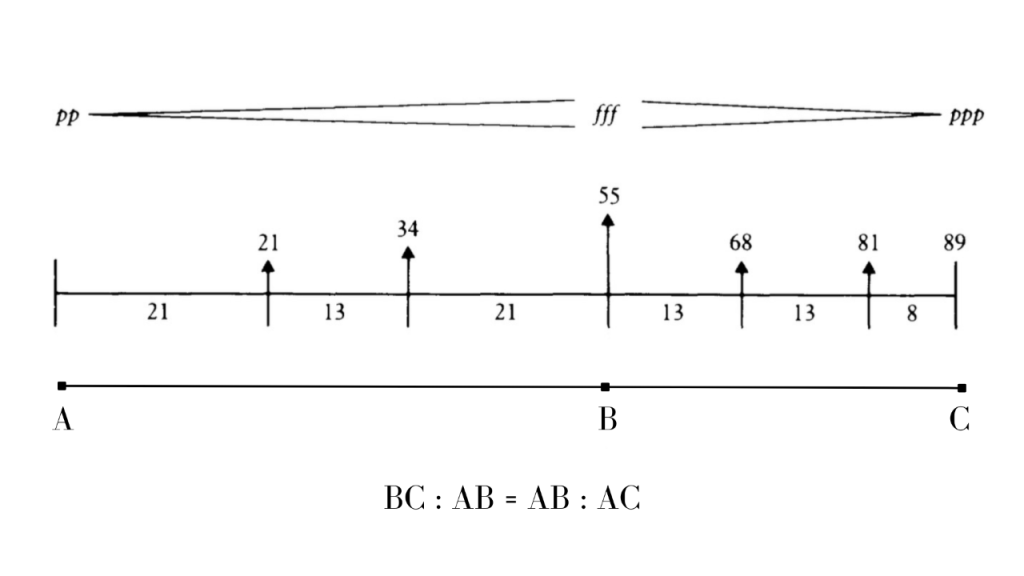Ora, alle fondamenta di questo brano, e in particolare del suo Primo movimento, così organicamente costruito, curato nel suo complesso così come nei suoi minimi dettagli, è stata ravvisata la presenza di un principio formale che ha suggestionato compositori antichi e moderni: la sezione aurea, che è espressione di una proporzione irrazionale in virtù della quale il tutto sta alla parte come la parte sta al rimanente e a cui è associato il celebre numero Φ, dal valore approssimabile a 1,618. Da sempre il raccordo tra opera della natura e opera dell’uomo – basti soltanto pensare a un comunissimo girasole o a una conchiglia, oppure agli strumenti a corda costruiti da Stradivari –, la sezione aurea è strettamente connessa alla Serie di Fibonacci, in cui ogni termine è la somma dei due precedenti: infatti, il limite dei quozienti dei termini della progressione geometrica di Fibonacci è proprio Φ.