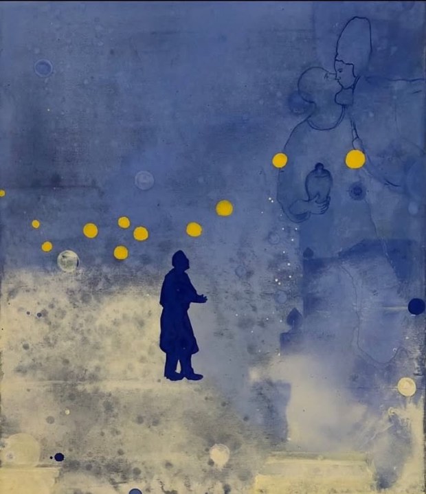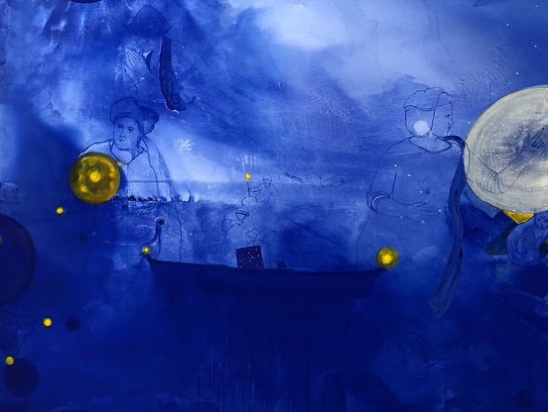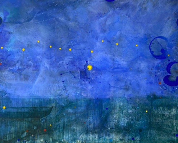 Pigmenti naturali su tela o carta, impastati con del legante di produzione svizzera. Così sono state realizzate queste tele di Emilio d’Elia, pittore italiano, e parigino d’adozione, che ha avuto la pazienza di raccontarmi la grammatica della sua arte. I linguaggi espressivi cambiano rapidamente, è vero, ma la relazione degli artisti con il blu non mai ha perso di intensità: D’Elia fa di questo colore il protagonista senza tempo delle sue opere. E, come nei dipinti che abbiamo appena visto, il blu è spesso illuminato dal giallo. Il figurativismo non scompare, ma prevale il sentire cromatico che solo il pigmento naturale è in grado di restituire. Tutto questo, con tre sole tonalità di blu: blu oltremare scuro, blu oltremare chiaro e blu di Prussia. Il colore non è però steso in modo materico; i colori vengono spesso diluiti dall’artista fino a ottenere un effetto acquerellato. La profondità abissale che il blu schiude non fa più paura, perché è incredibilmente leggera. Ora sappiamo che l’alba è vicina. E, attraverso gli occhi dell’artista, scopriamo qualcosa che difficilmente avremmo potuto immaginare: l’infinito può essere intimo e toccante.