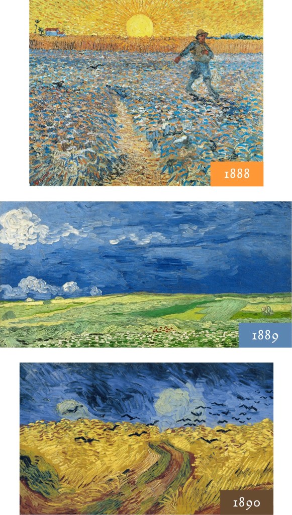 Il blu era stato sinonimo di profondità, durante tutta la parabola creativa di Van Gogh. Se accostato alle tinte del giallo, ecco che quella profondità prendeva a pulsare di una vitalità incontenibile, ampliando le prospettive. Lo si vede bene in Seminatore al tramonto. D’altronde, l’uomo attraversa il campo spargendo sementi, promessa di nuova vita. A distanza di un anno, Campo di grano con nuvole temporalesche (1889) reca il peso di una situazione che sta cambiando. Il suo cielo, che ha una consistenza pastosa e scorrevole, non è certo poco profondo. Anzi, lo è al punto che il campo di grano, pur suggerendo la sua vastità, sembra gravato dal raggrumarsi delle pennellate in tormentati nodi di cielo. Il verde, portatore di serenità, è quasi compresso dal blu. Il giallo non è assente dalla tela, affiora qua e là a ravvivare le coltivazioni di grano, ma è smorzato, esangue. Tutto ciò che si intravede è un flebile spiraglio di speranza. Si avverte tutta la tensione di un temporale incombente, che si abbatterà nella vita e nell’arte di Van Gogh: Campo di grano con volo di corvi risale al 1890, anno della sua morte.